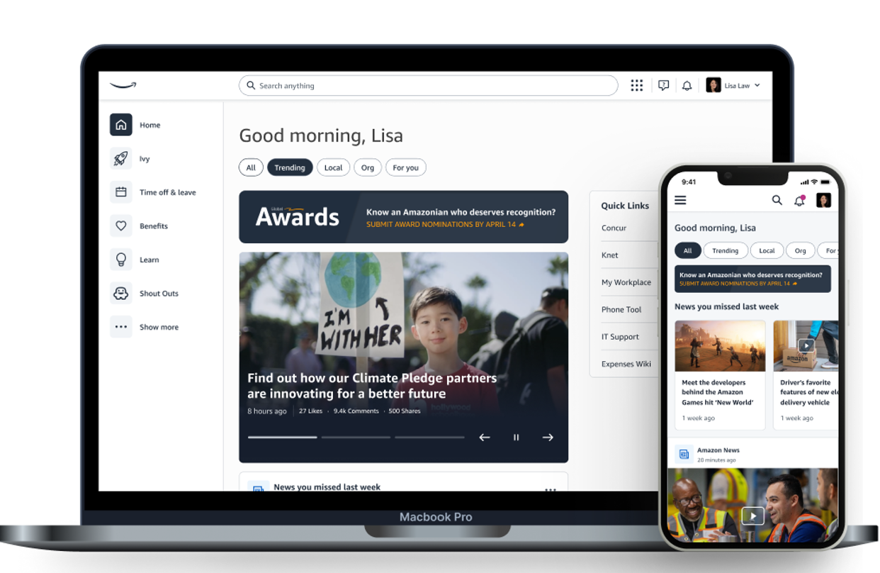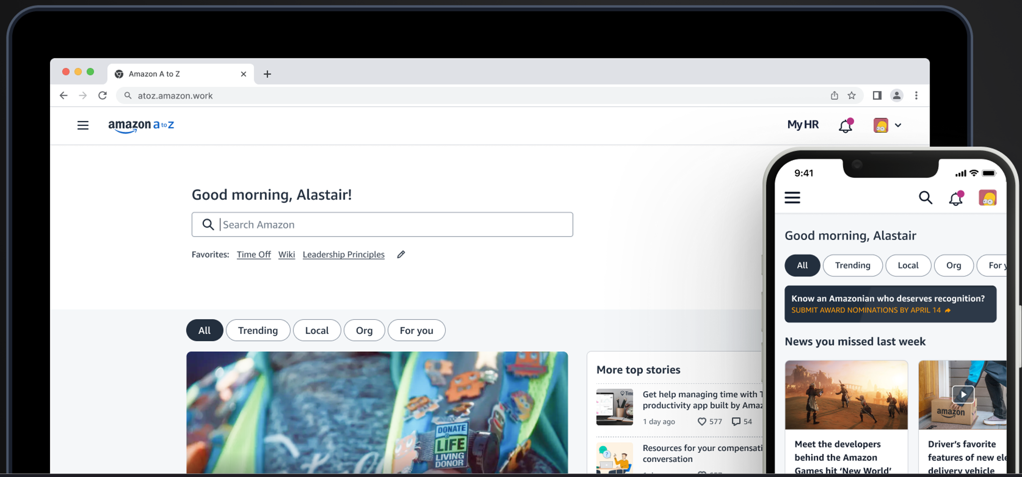 Inside Amazon is the default corporate landing page for all Amazon Employees. It’s used to search documents across the company, for corporate communications, it’s where employees go to find the latest corporate policies relating to HR and business practice, it’s the launch page for phone tool, news, HR tools and