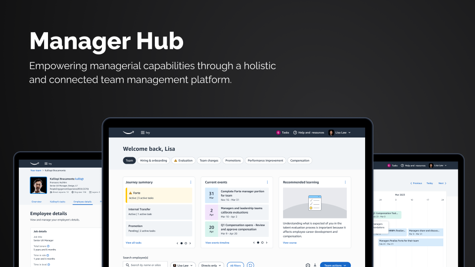 We were tasked to create a simple to understand single place to go to manage tasks relevant to them (as an individual or as a manager). A secure place that was available both on web and mobile. That felt integrated into the Amazon Intranet.